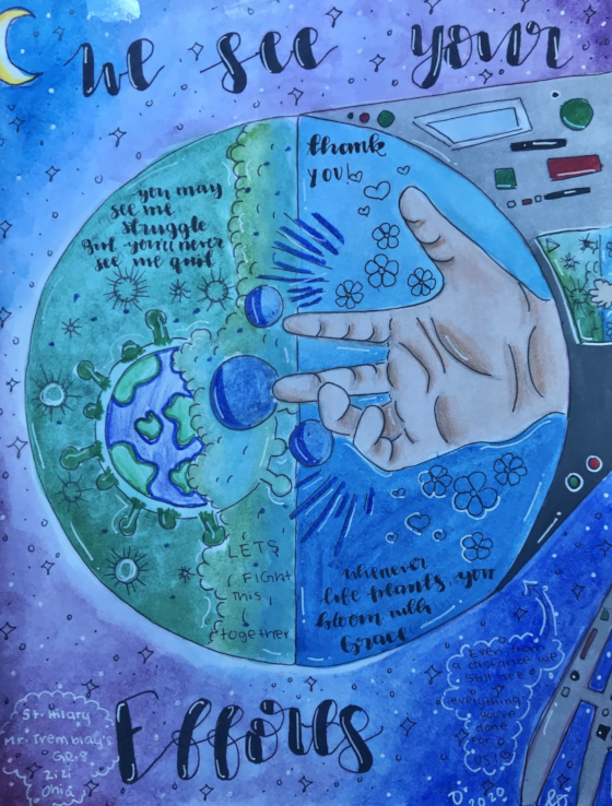 This poster celebrates the work of our front-line workers during the COVID-19 pandemic. I drew a telescope to show that even though they work away from us, their daily sacrifice to ensure our safety is clear to see. They are the stars. On the eyepiece of the telescope is an image symbolizing their willingness to give a helping hand with a positive attitude, pushing against the virus.